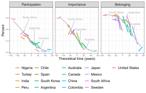 Raziskovalci so odkrili, da to sekularizacijsko zaporedje (udeležba-pomembnost-pripadnost) velja tako za mlade kot starejše. Pri obojih najprej upade udeležba, nato pomembnost in šele na koncu pripadnost. Zaporedje lahko opazimo na vseh celinah, a v različnih fazah. Afrika je šele na začetku svoje sekularizacijske poti. Generacijski razkorak je že jasno viden za udeležbo, za pomembnost se šele nakazuje, pripadnost pa ostaja visoka pri mladih in starejših. Evropa je v kasnejši fazi: udeležba in pomembnost sta precej nizki za vse, upadati pa je začela tudi pripadnost.